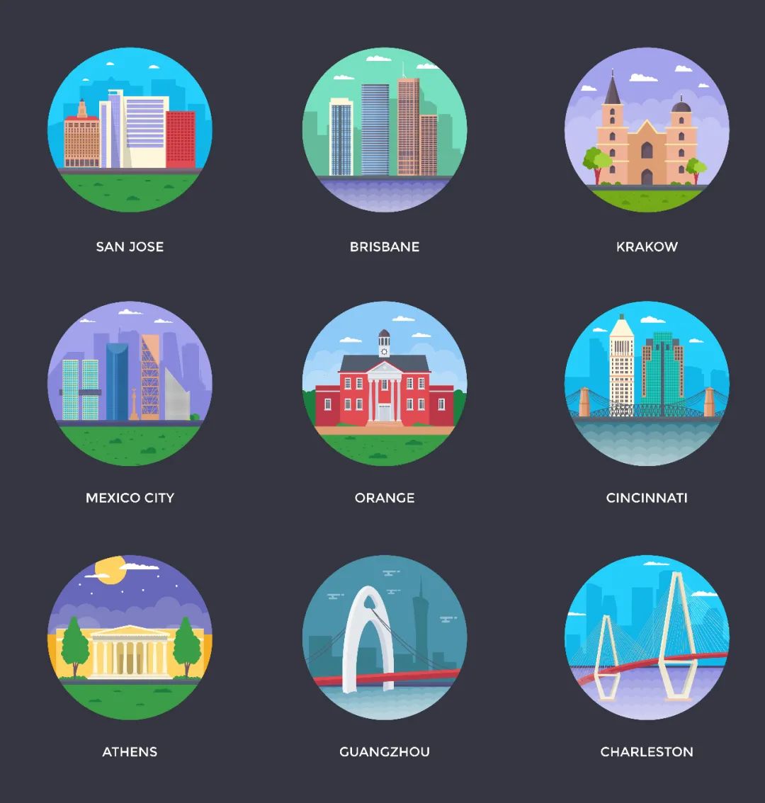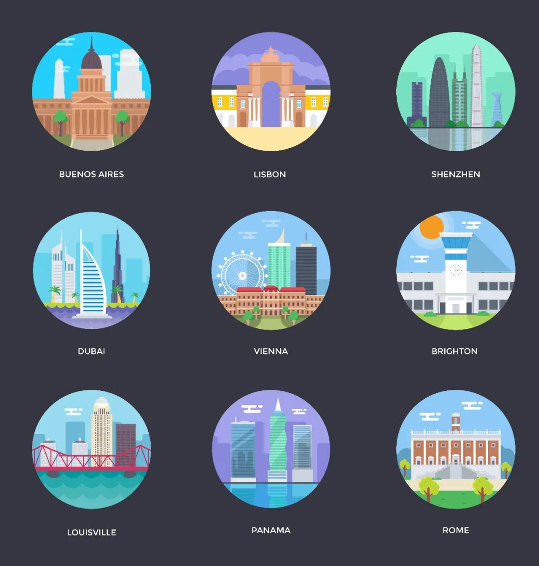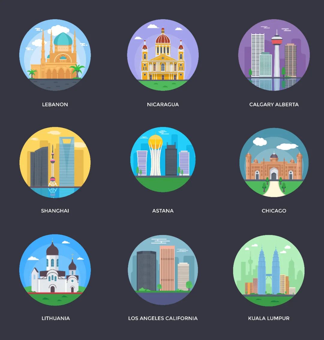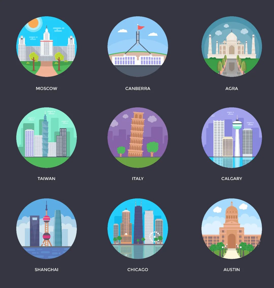 今天为大家分享的是128个世界主要城市矢量插画图形打包下载,希望大家喜欢,享用吧!包含世界著名城市的平面图标集,这些城市因其在一个领域或其他领域的竞争力而闻名,这些领域包括电力,金融,音乐,时尚,工业,经济等。这个大都市城市的彩色创意平面矢量图标包是旅游行业满足其客户需求的新创意解决方案。它不仅可以单独用于旅行项目,而且对于围绕这个概念的所有设计任务都适用shi。