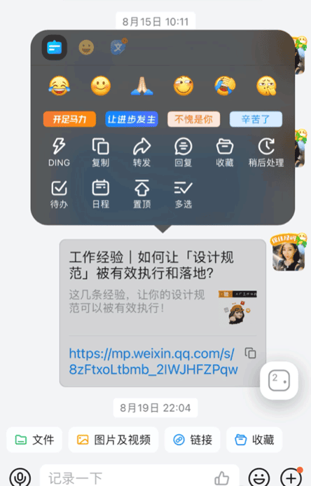 钉钉新增了“文字表情”,表情的语义反馈更加直接,样式引导的小动效也很贴切。