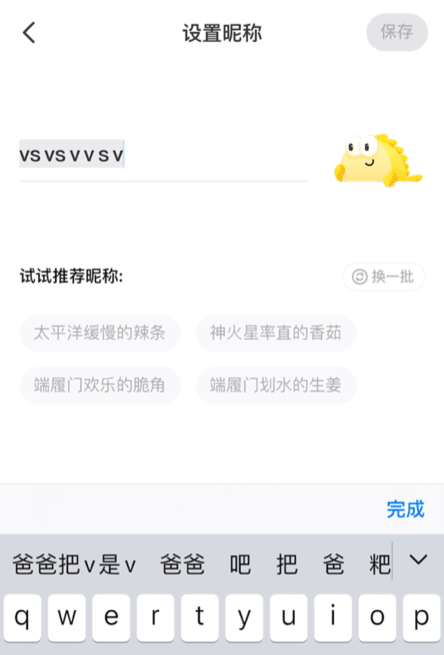 咸鱼 App 给自己设置昵称时的提示很有意思,右侧咸鱼的表情会根据昵称是否通过而产生变化。同时也会给用户推荐一些有意思的名字做选择。