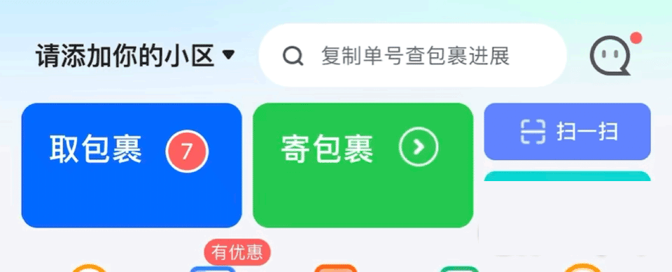 菜鸟裹裹寄包裹的动态 icon 设计,很有趣,也可以提醒用户寄包裹有新的优惠券。