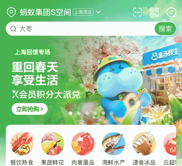 盒马App的头图,背景会随着头图的变化而相应变化,视觉上的沉浸式感受会更强。