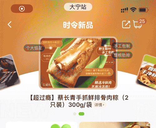 叮咚买菜的时令新品推荐,交互形式采用动图和滑动展示,也使用了可以灵活变换内容的 Tag 强调关键词。